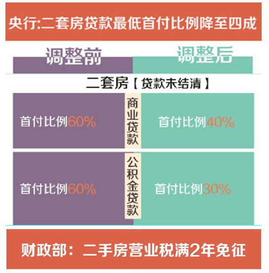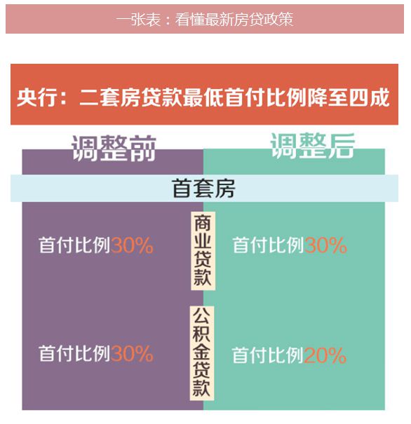 央行、住建部、银监会联合下发通知,对拥有一套住房且相应购房贷款未结清的居民家庭购二套房,最低首付款比例调整为不低于40%。 同时,缴存职工家庭使用住房公积金委托贷款购买首套普通自住房,最低首付比例下调为20%;拥有一套住房并已结清贷款的家庭,再次申请住房公积金购房,最低首付比例为30%。