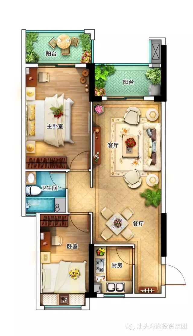 温馨之家,浪漫风情。两房两厅一卫,如若新婚夫妇,一房可作为书房,用于业余办公阅读。如若三口之家,也能让孩子具有私人空间,培养独立生活能力。双景阳台,其一可加以设计,打造为风雅之所,品茗、赏月、待客、观景均无不可。